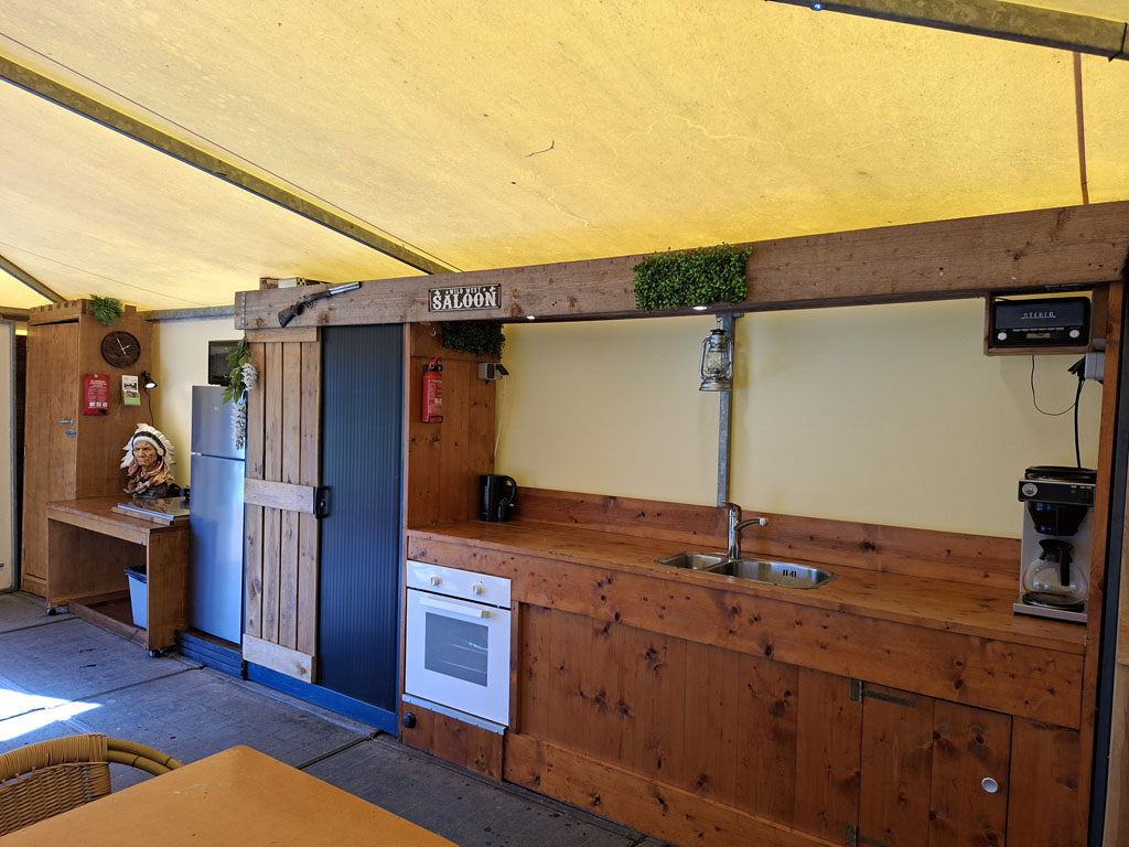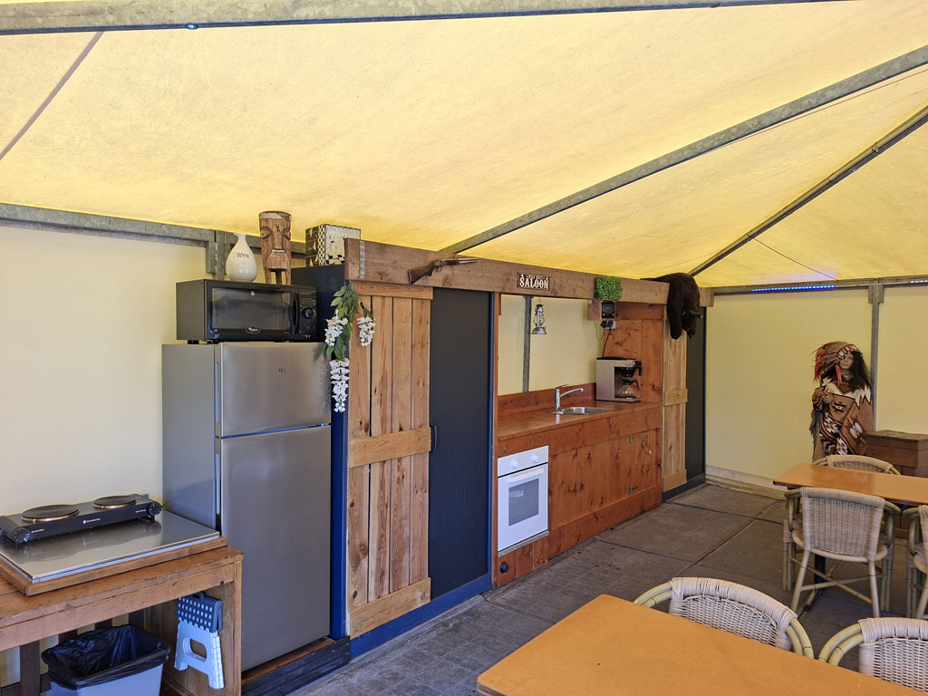 Er is een kleine Kinder Saloon met zandbak, een paardenwagen en optioneel een luxe grote leeftent om in te koken.