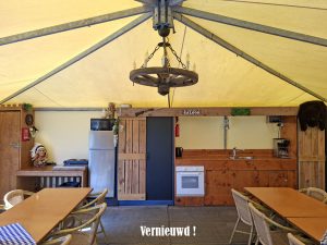 Dit is een grote leeftent van ruim 50 m2 die compleet is ingericht met tafels, stoelen,