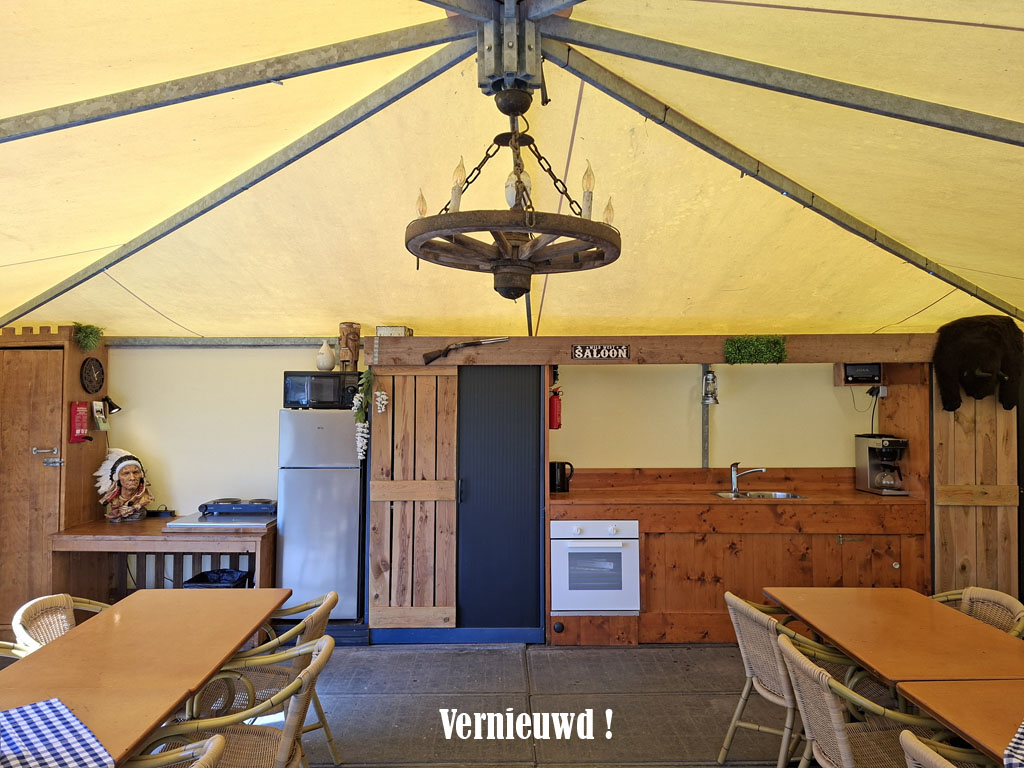 De Kleine Bizon is een zeer luxe leeftent die je erbij kan huren en is van alle gemakken voorzien.